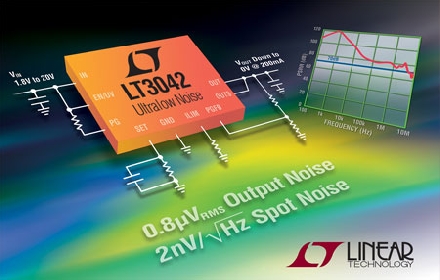 Linear推出領(lǐng)先的超低噪聲、超高電源紋波抑制 (PSRR) 低壓差電壓線性調(diào)節(jié)器 LT3042。該器件獨特的設計具有僅為 2nV/√Hz (在 10kHz) 的超低點噪聲和 0.8µVRMS 的積分輸出噪聲 (在 10Hz 至 100kHz 的寬帶寬內(nèi))。低頻和高頻 PSRR 性能是異常出眾。低頻 PSRR 超過 90dB (直到 10kHz),而高頻 PSRR 則超過 75dB (直到 3MHz),可使噪聲或高紋波輸入電源變得 “安靜”。LT3042 運用了 LTC 的專有 LDO 架構(gòu),即在一個高精度電流源基準之后布設一個高性能單位增益緩沖器,從而可產(chǎn)生幾乎恒定的帶寬、噪聲、PSRR 和負載調(diào)節(jié)性能,這與輸出電壓無關(guān)。此外,該架構(gòu)還允許把多個 LT3042 并聯(lián)起來使用,以進一步降低噪聲、增加輸出電流和在印刷電路板 (PCB) 上散播熱量。