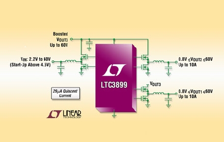 Linear推出三輸出 (降壓、降壓、升壓) 29µA 靜態(tài)電流、同步 DC/DC 控制器 LTC3899,該器件在 2.2V 至 60V 輸入范圍內(nèi)保持輸出電壓穩(wěn)定。12V 汽車電池在引擎重新啟動(dòng)或冷車發(fā)動(dòng)時(shí)可能降至低于 4V,從而導(dǎo)致信息娛樂系統(tǒng)以及其他采用 5V 或更高電壓工作的電子系統(tǒng)復(fù)位。升壓型轉(zhuǎn)換器為兩個(gè)降壓型轉(zhuǎn)換器供電,從而在汽車電池電壓下降時(shí)避免了輸出電壓下降,在怠速時(shí)關(guān)閉引擎以節(jié)省燃料的汽車啟/停系統(tǒng)中,這是一種非常有用的功能。60V 最高輸入電壓涵蓋雙電池卡車應(yīng)用;蛘,降壓型控制器可由輸入供電以用作通用的三路輸出控制器。
