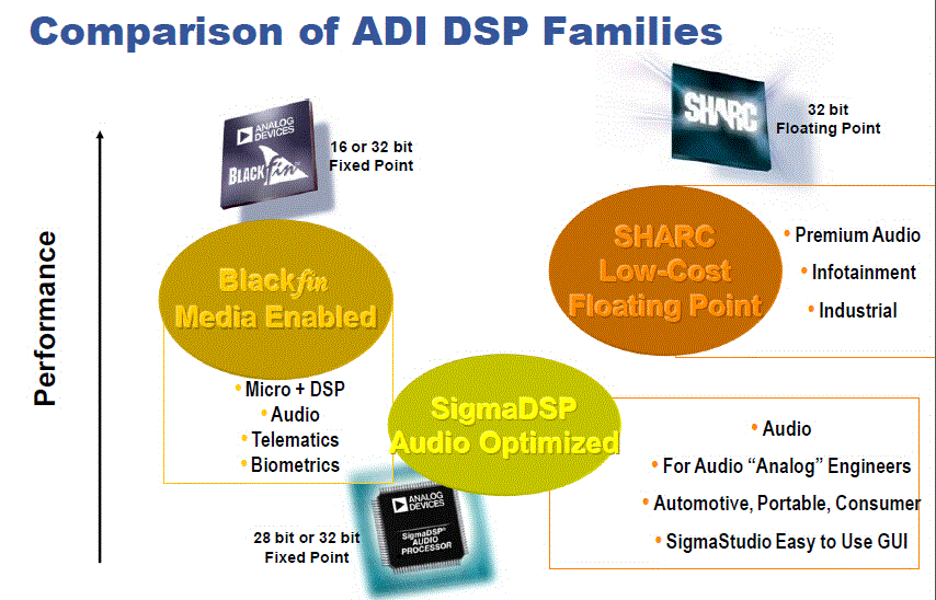 實(shí)際上,ADI針對(duì)音頻市場的不同要求,有著清晰的產(chǎn)品劃分。用在高端的是SHARC® DSP,用在中高端的是Blackfin® DSP家族,用在主流產(chǎn)品的是ADAU145x系列,入門級(jí)則由ADAU17xx擔(dān)當(dāng)。