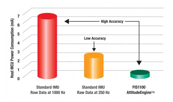 AttitudeEngine 在內(nèi)部以高速率處理六軸慣性數(shù)據(jù),并以與應(yīng)用需要匹配的低速率輸出給主機(jī)處理器,因此無(wú)需高頻率中斷。這樣,系統(tǒng)處理器處于休眠模式的時(shí)間就更長(zhǎng),從而為客戶提供更長(zhǎng)的電池壽命,而不會(huì)犧牲功能或準(zhǔn)確性。綁定的 XKF3 高性能 9軸傳感器融合算法綜合了來(lái)自芯片上的陀螺儀和加速計(jì)的慣性傳感器數(shù)據(jù)和來(lái)自外部磁力計(jì)的數(shù)據(jù)。傳感器融合還包括背景自動(dòng)校準(zhǔn),在準(zhǔn)確度、一致性和流動(dòng)性方面提供卓越的性能。結(jié)合 XKF3 傳感器融合算法后,F(xiàn)IS1100 成為世界上首款符合定位(四元素)規(guī)范的完整消費(fèi)電子慣性測(cè)量裝置,具有±3°的俯仰和側(cè)滾準(zhǔn)確度,以及±5°的偏航準(zhǔn)確度。
