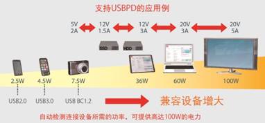 利用USB連接線,可進(jìn)行高達(dá)100W供受電的USB功率擴(kuò)展標(biāo)準(zhǔn)?山o筆記本電腦等以往無法通過USB供電進(jìn)行驅(qū)動(dòng)的設(shè)備供電,可實(shí)現(xiàn)移動(dòng)設(shè)備的快速充電(縮短充電時(shí)間)。