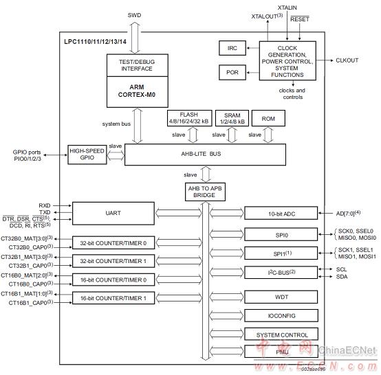 NXP公司的LPC1110/11/12/13/14/15是基于ARM Cortex-M0內(nèi)核的32位低成本MCU,提供性能,低功耗和簡單指令集和存儲器,和現(xiàn)有的8/16位MCU相比,能降低代碼大小.CPU工作頻率高達50MHz,主要用在馬達控制,家用電器,照明,白色家電,計量表和告警系統(tǒng).本文介紹了LPC111x系列主要特性和優(yōu)勢,框圖,LPCXpresso基板和目標板特性和電路圖.