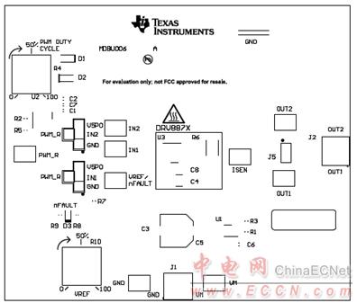 圖5.評(píng)估模塊DRV8872EVM PCB元件布局圖