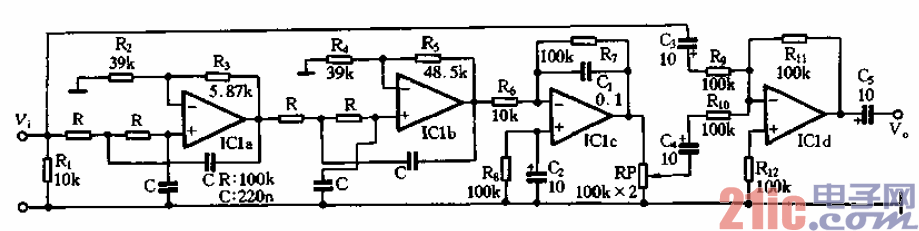 輸人信號(hào)經(jīng)ICl-a,ICl-b及外圍元件所組成的四階低通濾波器處理,其中心頻率為70Hz,衰減斜率為每倍額程24dB,增益為8.2dB。然后再由ICI-c組成的十倍緩沖放大器放大后輸出。被提升了的低頻信號(hào)與原始信號(hào)分別由白、C4送ICl-d混合處理后送人功率放大器。低頻信號(hào)與原始信號(hào)混合的量可由RP調(diào)節(jié),為了保證電位器RP關(guān)完后(低音信號(hào)混合量最小)原始信號(hào)的保真度,ICl-d混合放大器的增益設(shè)計(jì)為OdBo