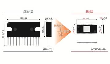 本產(chǎn)品通過采用DC/DC轉(zhuǎn)換器并優(yōu)化電源結(jié)構(gòu),使發(fā)熱量更低,實現(xiàn)了僅PCB板即可散熱的表面貼裝封裝(HTSSOP-A44)。由此,不再需要散熱板,與ROHM以往的產(chǎn)品相比,體積僅為1/14左右,有助于減少組裝工時,并進一步節(jié)省系統(tǒng) 內(nèi)部空間,降低設計負擔。