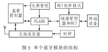 ROK101007型藍牙模塊是愛立信公司推出的適合于短距離通信的無線基帶模塊。它的集成度高、功耗小(射頻功率為1mW),支持所有的藍牙協(xié)議,可嵌入任何需要藍牙功能的設(shè)備中。該模塊包括基帶控制器、無線收發(fā)器、閃存、電源管理模塊和時鐘5個功能模塊,可提供高至HCI(主機控制接口)層的功能。單個藍牙模塊的結(jié)構(gòu)如圖5所示。