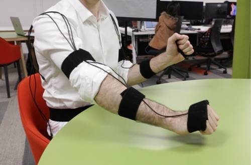 來自University of Southampton的SharkStream動作捕捉設備。通過在身體各個部位放置SharkStream傳感器節(jié)點(可以達到17個)就能精準地將人體動作輸入電腦。在現(xiàn)場的屏幕中,能看到展示人員身體、手臂、手腕的動作都精準地被屏幕中的3D人物呈現(xiàn)出來。