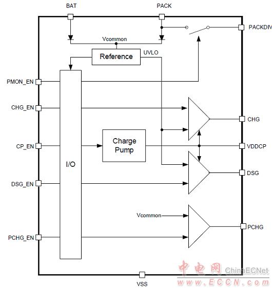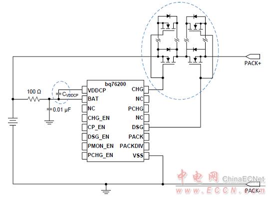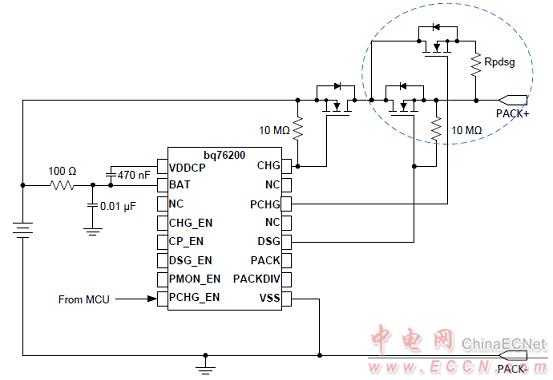圖3.bq76200簡(jiǎn)化應(yīng)用框圖:預(yù)充電的P溝FET和CHG FET并聯(lián)FET