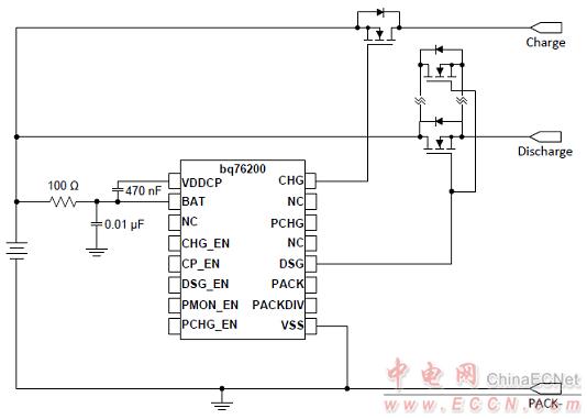 圖5.bq76200簡(jiǎn)化應(yīng)用框圖:單獨(dú)充電和放電通路
