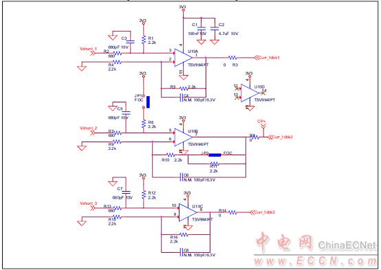 圖7.馬達(dá)控制平臺(tái)P-NUCLEO-IHM001電路圖:電流檢測(cè)調(diào)理電路