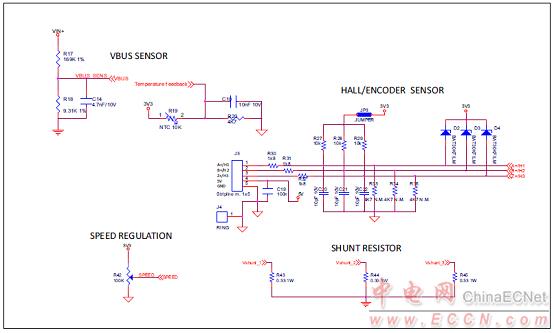 圖8.馬達(dá)控制平臺(tái)P-NUCLEO-IHM001電路圖:傳感器和并聯(lián)電阻電路