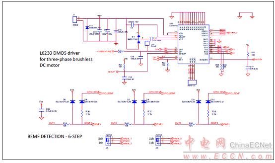 圖9.馬達(dá)控制平臺(tái)P-NUCLEO-IHM001電路圖:L6230驅(qū)動(dòng)器和BEMF檢測(cè)電路