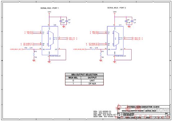 The CCG base board consists of a DC input power supply, a display multiplexer, a DisplayPort connector, a SuperSpeed Type-B port, and a Type-C port. The CCG4 daughter card consists of the CCG4 device and a USB-Serial IC to provide aUSB interface for debugging. CCG4‘s CC lines of the respective Type-C interface are connected to the Type-C port on the CCG base board. CCG4 controls the display multiplexer over an I2C interface.