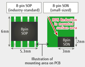 除了業(yè)界標準8引腳SOP之外,該產(chǎn)品還提供小型8引腳SON版本,其安裝面積約為SOP的20%(圖3);安裝體積則為SOP的8%,適用于需要小型化的應(yīng)用。