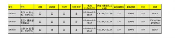 ICN2028內部采用了電流精確控制技術,可使片間誤差低于±2.5%,通道間誤差低于±1.3%。ICN2028與上一代ICN2025/26的性能對比見下表。