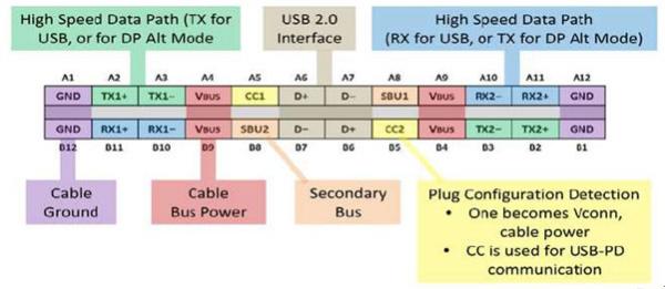 圖1:USB Type-C的接口功能定義,從結(jié)構(gòu)上實現(xiàn)了無方向正反插