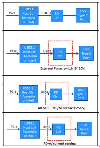 圖2:四種USB Type-C過流保護方案設(shè)計架構(gòu)