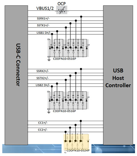 USB Type-C的過壓保護方面是通過TVS來實現(xiàn)的。由于USB Type-C正反插無方向的結(jié)構(gòu),其具有上下兩組對稱的接口,每組包括兩組10Gbps高速數(shù)據(jù)收發(fā)通道(SSRX+/SSRX -,SSTX+/SSTX -)、一組兼容以前USB標準的480Mbps數(shù)據(jù)通道(D+/D-)和一組進行USB-PD協(xié)議通信的專用通道(CC+/-),所以需要保護的通道數(shù)量也較以往的USB接口更多,這就需要TVS陣列出場了。為此電路保護元器件廠商推出了小型化、高集成的方案。比如Bourns的方案, 利用兩個6通道TVS陣CDDFN10-0516P列和一個4 通道TVS陣列CDDFN10-0524P,只需三顆器件就完成了USB Type-C的過壓保護。