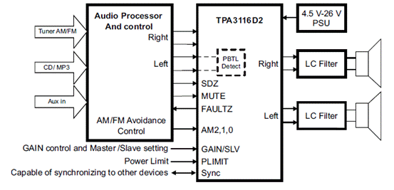 The TPA31xxD2 advanced oscillator/PLL circuit employs a multiple switching frequency option to avoid AM interferences; this is achieved together with an option of Master/Slave option, making it possible to synchronize multiple devices.