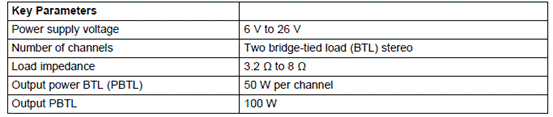 The TPA3116D2 is a 50-W (per channel), efficient, stereo, digital-amplifier power stage for driving two bridge-tied speakers or a single parallel bridge-tied load. The TPA3116D2 can drive a speaker with an impedance as low as 3.2 Ω (4 Ω typical).