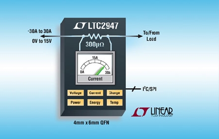 Linear推出針對 0V 至 15V DC 電源軌的功率和能量監(jiān)視器LTC2947。大多數(shù)功率和能量監(jiān)視器 IC 都運用外部檢測電阻器測量電流。然而,選擇檢測電阻器不是一個容易的任務(wù),尤其是在處理大電流時,因為此時所用檢測電阻器可能消耗太多功率、占用大量電路板空間或?qū)y量準(zhǔn)確度造成很大影響。LTC2947 集成了一個300µΩ溫度補(bǔ)償檢測電阻器以減輕這些問題,從而為用戶提供一個簡單的24mm2解決方案,以在高達(dá)±30A電流提供準(zhǔn)確度高達(dá) 1.2% 的能量讀數(shù)。當(dāng)測量 30A 滿標(biāo)度電流時,LTC2947 集成型檢測電阻器的壓降僅為大約 9mV,產(chǎn)生約四分之一瓦功耗,或在測量6A 電壓軌時產(chǎn)生大約 10mW 功耗。除了低功耗,LTC2947 還具備大動態(tài)范圍,因為其失調(diào)僅為非常小的 6mA (或1.8µV)。