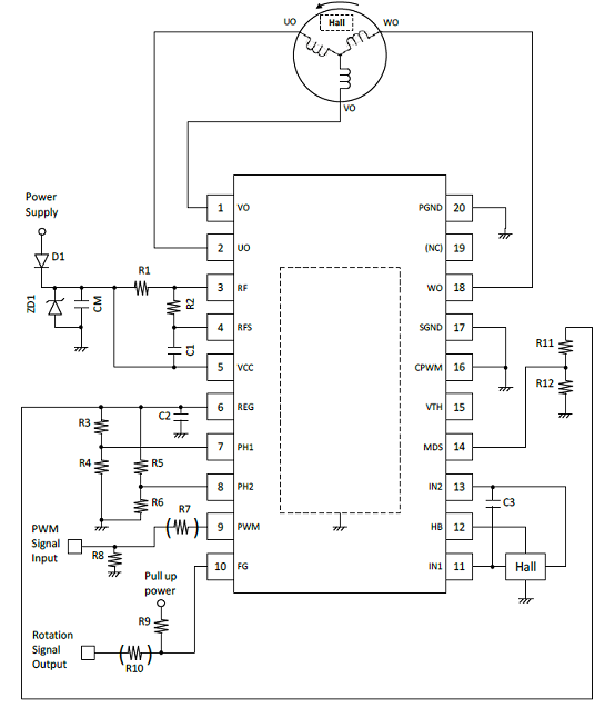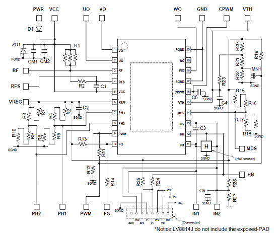 圖2.采用一個(gè)霍爾傳感器的LV8811G/13G三相BLDC馬達(dá)驅(qū)動(dòng)電路圖(1)