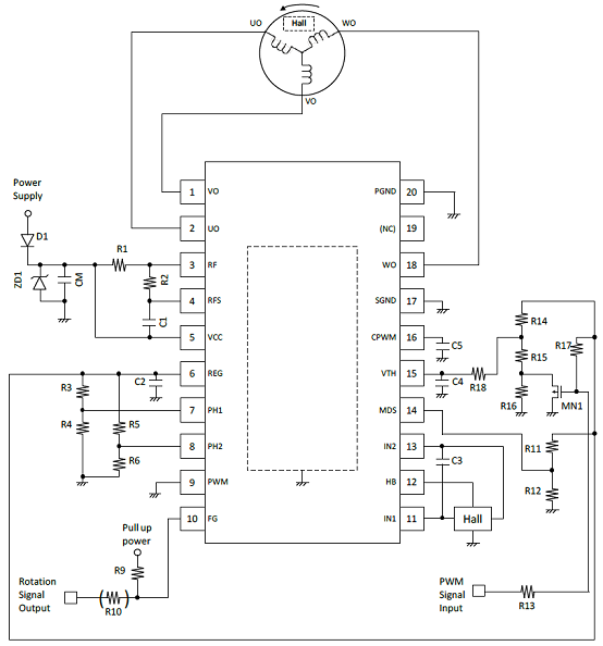 圖3.采用一個(gè)霍爾傳感器的LV8811G/13G三相BLDC馬達(dá)驅(qū)動(dòng)電路圖(2)