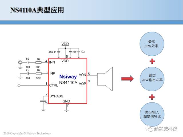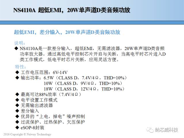 納芯威科技全新推出20W單聲道D類音頻功放NS4110A。NS4110A是一款差分輸入,超低EMI,無需濾波器,20W單聲道D類音頻功率放大器。通過高低電平控制芯片開啟與關(guān)斷,當高電平時芯片進入D類工作模式,低電平時芯片關(guān)斷,應用靈活方便。NS4110A 采用先進的技術(shù),在全帶寬范圍內(nèi)極大地降低了 EMI 干擾,最大限度地減少了對其他外部元件的影響。其輸出無需濾波器的 PWM 調(diào)制結(jié)構(gòu)減少了外部元件、PCB面積和系統(tǒng)成本。NS4110A12V的工作電壓時,能夠向4Ω負載提供高達18W的輸出功率,88%以上的效率更加適合便攜式音頻系統(tǒng)。