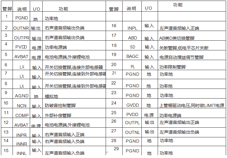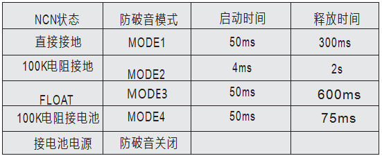 在音頻應(yīng)用中,輸入信號(hào)過大或者電池電壓下降等因素都會(huì)導(dǎo)致音頻功放的輸出信號(hào)發(fā)生破音失真,而且過載的信號(hào)會(huì)對(duì)揚(yáng)聲器造成永久性損傷。CS8359C獨(dú)特的無破音(NCN)功能可以通過檢測(cè)放大器輸出信號(hào)的破音失真,自動(dòng)調(diào)整系統(tǒng)增益,使得輸出音頻信號(hào)保持圓潤(rùn)平滑,不僅有效地避免了大功率過載輸出對(duì)喇叭的損 壞,同時(shí)帶來更舒 適的聽覺享受。CS8359C提供四種NCN工作模式和不防破音模式可供用戶選擇 :M1,M2,M3,M4,NCNOFF,可以通過設(shè)置NCN引腳的不同狀態(tài)來分別進(jìn)入五種模式。啟動(dòng)時(shí)間(Attack Time): 從發(fā)生破音失真到系統(tǒng)自動(dòng)增益調(diào)節(jié)完成的時(shí)間間隔。釋放時(shí)間(Release Time):從破音失真消失到系統(tǒng)完全退出增益衰減狀態(tài)的時(shí)間間隔。通過NCN管腳狀態(tài)設(shè)置M1,M2,M3,M4,NCNOFF模式的啟動(dòng)時(shí)間和釋放時(shí)間如下表所示。