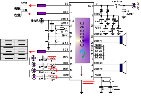 CS8359C內(nèi)部集成了穩(wěn)壓電路,因此不需要通過Vbat為CS8359C供電,也就不需要貼片去耦電容,直接連接電感即可。但一般我們建議至少為Vbat加入一個(gè)儲(chǔ)能電解電容,因?yàn)樯龎弘娫春凸Ψ哦际菑腣bat獲取電流的。一個(gè)220uF的電解電容有助于使電池電壓更平穩(wěn),減少對(duì)系統(tǒng)上其他IC的干擾,也有助于提升CS8359C的低頻瞬態(tài)響應(yīng),也有助于EMI的降低。