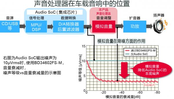 另一方面,音響用SoC*4)作為車載音響的核心,隨著制造工藝的微細(xì)化發(fā)展而呈現(xiàn)低電壓趨勢,可處理的音頻信號變小,本底噪聲相對增加。這個課題的解決方法要求在SoC的后段具備低噪聲且高音質(zhì)的模擬音量。