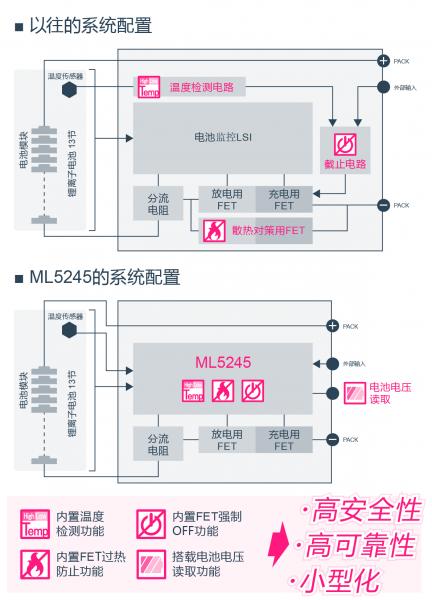 作為其應(yīng)對措施,以往是通過對電池監(jiān)控LSI增加外圍電路的形式來確保電池組的安全,而新開發(fā)的ML5245集成了這些外圍電路功能,從而可實現(xiàn)系統(tǒng)的小型化與更高可靠性,并進(jìn)一步提高電池組的安全性。