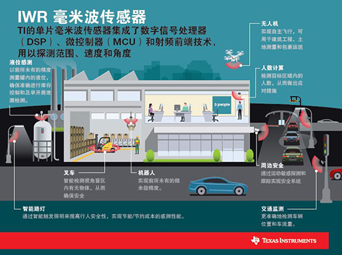 為了應(yīng)對工廠、樓宇自動化系統(tǒng)和智能基礎(chǔ)設(shè)施中對于更高效率的需求,開發(fā)人員現(xiàn)在能夠充分利用TI的智能化且穩(wěn)健耐用的毫米波傳感器產(chǎn)品組合。此外,在一些需求不斷增長的應(yīng)用領(lǐng)域,如醫(yī)療設(shè)備、箱內(nèi)液位感測、機器人視覺和無人機等,這項感測技術(shù)可用于改造現(xiàn)有的一些功能。TI的IWR1x 毫米波非接觸式傳感器不受環(huán)境中的光照、降雨、灰塵、下霧或霜凍的影響,這使它們在室內(nèi)或室外都能穩(wěn)健運行。通過確定設(shè)備周圍物體的所處范圍、速率和角度,這些傳感器能立即適應(yīng)動態(tài)變化的場景。