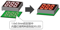 然而改變顯示顏色需要使用2個(gè)LED,與單色型相比,雙色型存在不僅尺寸變大,還需要準(zhǔn)備單色用和雙色用兩種封裝,開發(fā)成本加倍的課題。