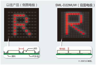 封裝采用背面電極,可很窄間隔安裝。這在點(diǎn)陣等中可實(shí)現(xiàn)非常高清晰的顯示。