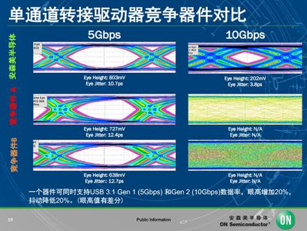 在安森美半導(dǎo)體的完整方案中,有這樣一個(gè)器件叫“轉(zhuǎn)接驅(qū)動(dòng)器”,這個(gè)器件究竟起到了什么作用呢?李先生說到,在數(shù)據(jù)傳輸方面,USB Type-C可以取代通用接口如VGA、HDMI等不同標(biāo)準(zhǔn),在USB3.0和Type C環(huán)境下傳輸速率可達(dá)到5Gbps或10Gbps,這便需要用到轉(zhuǎn)接驅(qū)動(dòng)器來減少碼間串?dāng)_,防止不想要的信號(hào)失真而影響傳輸,以符合USB3.0X眼圖高度和總抖動(dòng)規(guī)范。相比市場上其它同類產(chǎn)品,安森美半導(dǎo)體一個(gè)器件可同時(shí)支持USB3.15Gbps和10Gbps的數(shù)據(jù)率,眼高增加20%,抖動(dòng)降低20%。而其它方案僅支持5Gbps,且眼高和抖動(dòng)方面都不及安森美半導(dǎo)體。另外,USB線纜越長,信號(hào)會(huì)越弱,在線里增加轉(zhuǎn)接驅(qū)動(dòng)器后,可用來增強(qiáng)信號(hào)的性能。換句話說,線纜長度和性能將推動(dòng)對轉(zhuǎn)接驅(qū)動(dòng)器和高質(zhì)量互聯(lián)的需求。