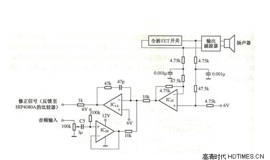 D類功放將音頻信號轉(zhuǎn)變?yōu)閷挾入S信號幅度變化的高頻脈沖,控制功率管以相應(yīng)的頻率飽和導(dǎo)通或截止,功率管輸出的信號經(jīng)低通濾波器驅(qū)動揚聲器發(fā)聲。因功率管大部分時間處于飽和導(dǎo)通和截止狀態(tài),功率損耗很小,其效率可達90%以上。典型的D類功放可提供200W輸出,效率達94%,諧波失真在1%~2.8%。
