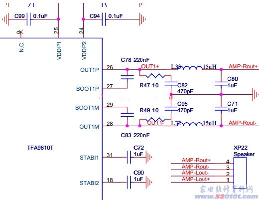 TFA9810T輸出端為低通濾波器,由下圖中C78/R47/C82/L33/C83/C80/R49/C71/C95/L32等構(gòu)成,對PWM方波中15 Hz~20 kHz音頻成分表現(xiàn)為直通效應(yīng),對超過音頻范圍的20 kHz以上高頻成分呈現(xiàn)-12 dB/倍頻程滾降率。