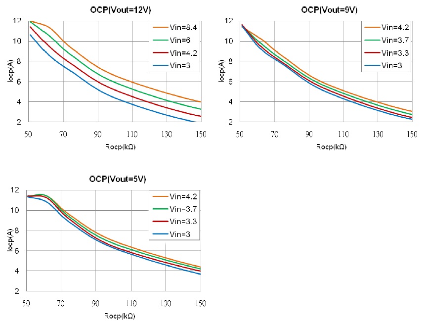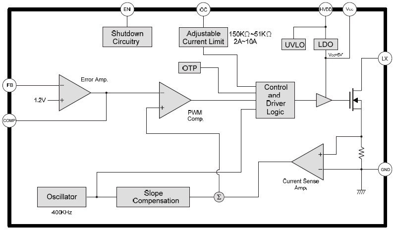 檢測通過LX 與GND 之間MOS 電流,也就是電感峰值電流,觸發(fā)過電流會(huì)將佔(zhàn)空比縮小,限制電感電流,輸出電壓也會(huì)降低;當(dāng)佔(zhàn)空比50%以上觸發(fā)OCP,為了讓PWM 穩(wěn)定方波,IC內(nèi)部做斜率補(bǔ)償,佔(zhàn)空比越大OCP 會(huì)降低,透過外部電阻R3 調(diào)整OCP,R3 選用參考以下圖表,電阻值150kΩ~51kΩ,OCP 2A~10A,OC Pin 不能空接。