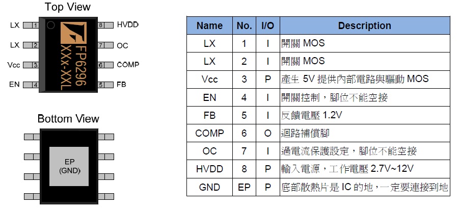 FP6296是一顆電流控制模式升壓轉(zhuǎn)換器,脈波寬度調(diào)變(PWM),內(nèi)置15mΩ/10A/14VMOSFET,能做大功率高轉(zhuǎn)換效率,周邊元件少節(jié)省空間,適合用在行動(dòng)裝置,寬工作電壓2.7V~12V,單節(jié)與雙節(jié)鋰電池都能使用,精準(zhǔn)反饋電壓1.2V(±2%),過電流保護(hù)透過外部電阻調(diào)整,電流控制模式讓暫態(tài)響應(yīng)與系統(tǒng)穩(wěn)定性佳,輕載進(jìn)入省電模式(Skip Mode),達(dá)到輕載高效率,封裝為SOP-8L(EP)。