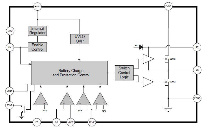 多種保護(hù)功能:輸入欠壓保護(hù)、輸入過壓保護(hù)、芯片過溫保護(hù)、電池短路保護(hù)、電池溫度監(jiān)控