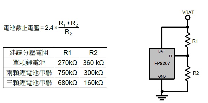 FB PIN 內(nèi)部的參考電壓為2.4V,可藉由外部分壓電阻設(shè)定電池的截止電壓,F(xiàn)P8207 可調(diào)整的截止電壓範(fàn)圍為4.2V~12.6V,可參考下面計算方法。