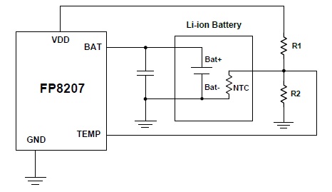 FP8207 設(shè)有內(nèi)建過壓保護(hù)功能,當(dāng)輸入adaptor 電壓超過20V 時,IC 將會關(guān)機(jī)以防止受到損傷,當(dāng)過壓保護(hù)發(fā)生時需等輸入電壓掉到過壓保護(hù)點的遲滯電壓以下(約0.5V)才會恢復(fù)正常充電。