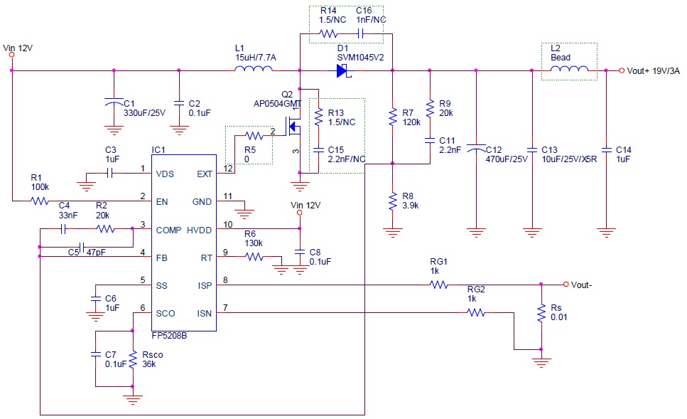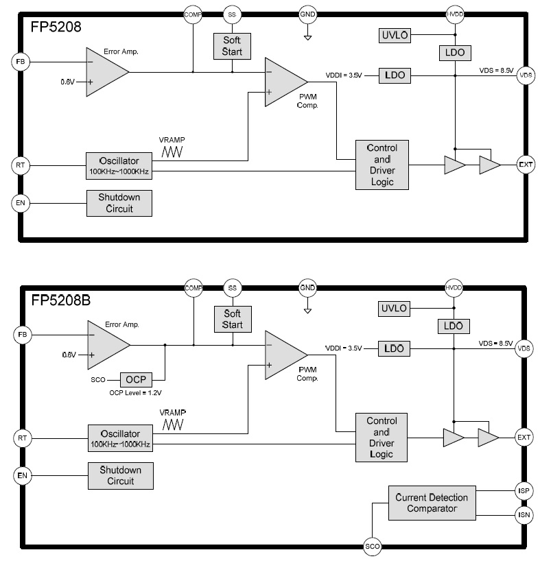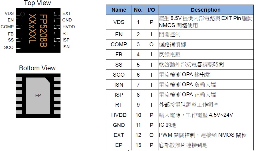 (FP5208 少了SCO, ISP, ISN Pin,其他元件都與FP5208B 相同)