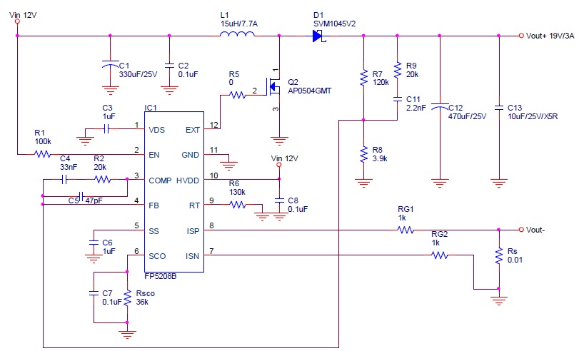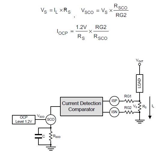 如下圖在輸出負(fù)端與地之間接取樣電阻Rs,輸出電流IL 通過Rs 產(chǎn)生電壓Vs,再經(jīng)由RG1與RG2 接到ISP 與ISN,IC 會將Vs 放大在SCO Pin,Rsco/RG2 是放大倍率,MCU 檢測SCO電壓,就知道輸出電流大小,檢測誤差參考規(guī)格書第七頁。SCO 電壓到達(dá)1.2V 就會觸發(fā)過電流保護(hù)(OCP),將EXT Pin 佔(zhàn)空比縮小,降低輸出電壓,輸出電流愈大,輸出電壓愈低;SCO與地之間要接0.1uF。