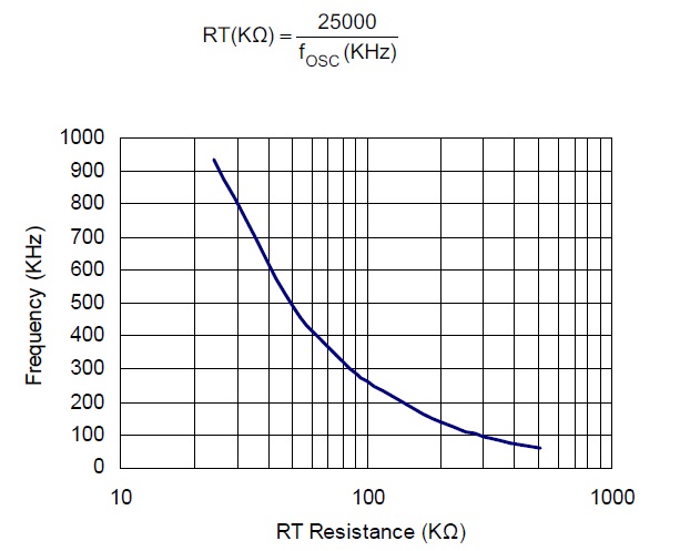 RT Pin 與地之間接電阻可以調(diào)整工作頻率,範(fàn)圍100kHz~1000kHz,當(dāng)RT 電阻不接,頻率是200kHz,電阻值與頻率關(guān)係參考以下公式與圖表。