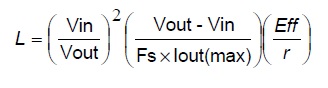 電感值計(jì)算公式,Vin 輸入電壓,Vout 輸出電壓,F(xiàn)s 工作頻率,Iout(max)輸出最大電流,Eff轉(zhuǎn)換效率,r 電感峰對峰值(IL 與電感平均電流的比例(一般設(shè)定在0.3~0.4)。舉例:Vin=12V、Vout=19V、Iout=3A(max)、Fs=200kHz、Eff=95%、r=0.3,代入公式求得電感L=15uH。