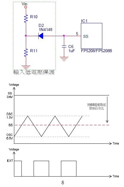 當(dāng)輸入電壓降低電流增加,導(dǎo)致Q2 過熱,在Vin 與SS 之間加電路,如下所示SS 正常為3.6V,IC 內(nèi)部OSC 震盪器最低0.5V,最高1.5V,Vin 降低SS 電壓透過D2 被拉低於1.5V,EXT PinPWM 最大佔(zhàn)空比被SS 電壓限制住,Vin 越低SS 電壓越低,佔(zhàn)空比越小,限制住輸入電流。