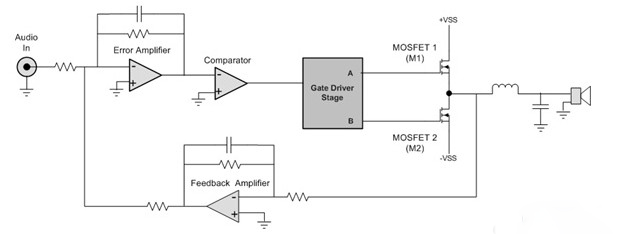PWM信號進行適當?shù)碾娖阶儞Q,然后送到柵極驅(qū)動器,這個驅(qū)動器控制由MOSFET(M1和M2)組成的雙態(tài)功率電路。放大后的信號然后通過輸出濾波器(消除PWM載波頻率),最終僅僅放大了的模擬音頻信號驅(qū)動揚聲器。通過把濾波器輸入信號反饋到錯誤放大器輸入端,進行外部環(huán)路濾波,降低了失真和噪聲,進一步提高了音頻輸出保真度。
