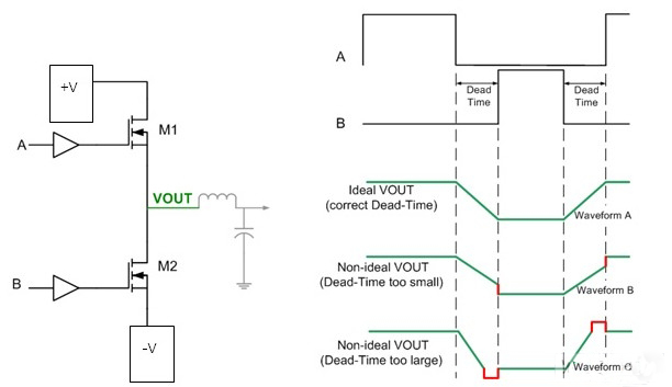 D類放大器死區(qū)時間(即兩個開關均處于關閉狀態(tài)時的時間段)直接影響到效率和THD。過于短暫的死區(qū)時間會引起直通電流,降低效率,過長的死區(qū)時間又會增大THD,這會給音頻保真度帶來不利影響。